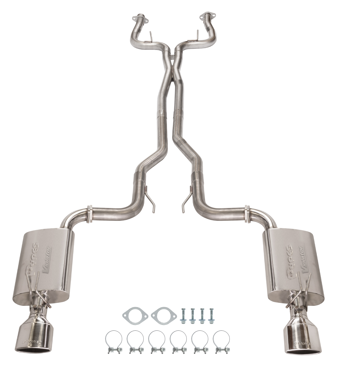 The X-pipe design will provide an increase in performance and improved sound, while the polished 304 stainless steel mufflers and; oval tips offer a sharp appearance. This kit comes with all the necessary installation hardware.