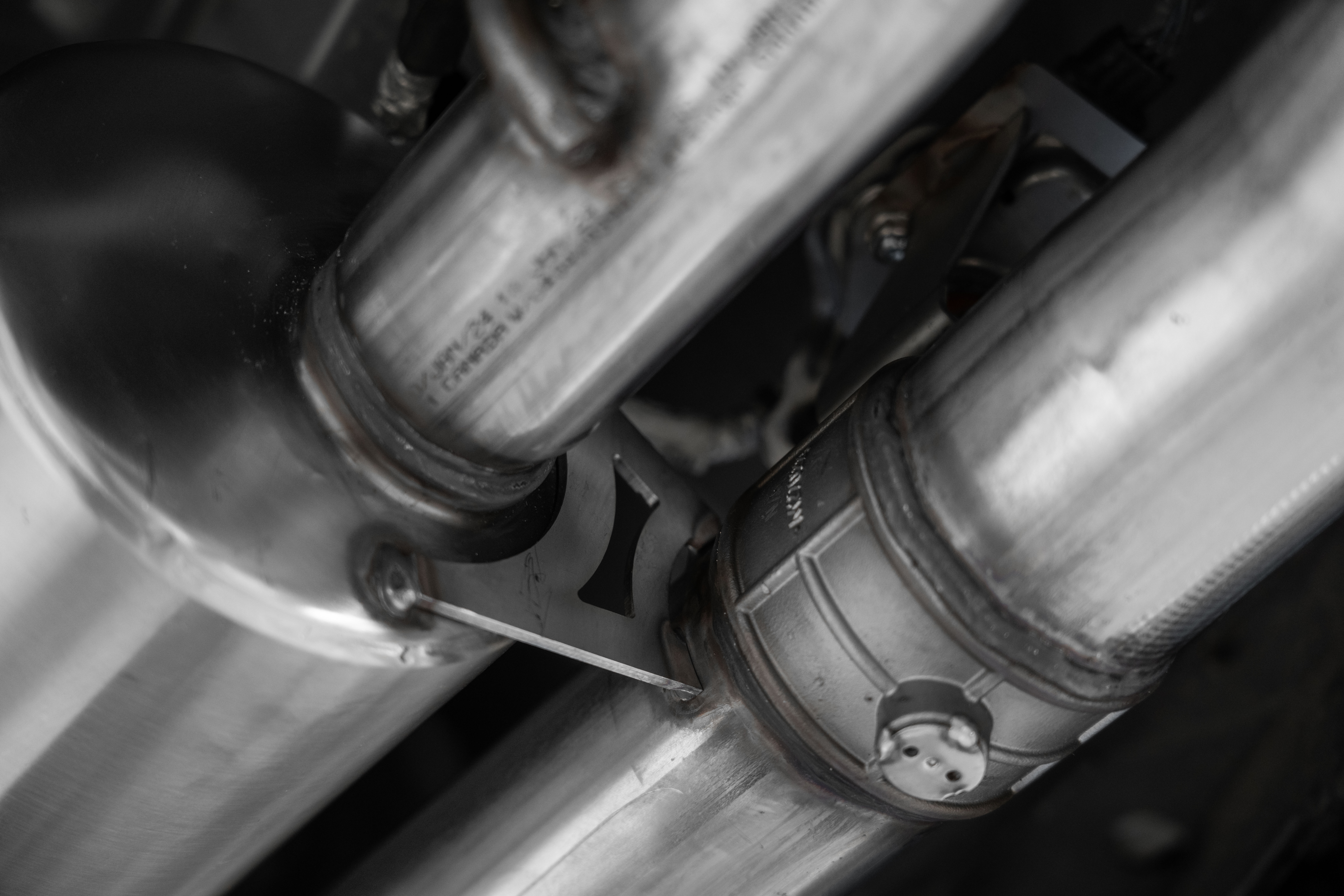 T304 Stainless steel cat-back exhaust with quad split rear exit and carbon fiber exhaust tips.