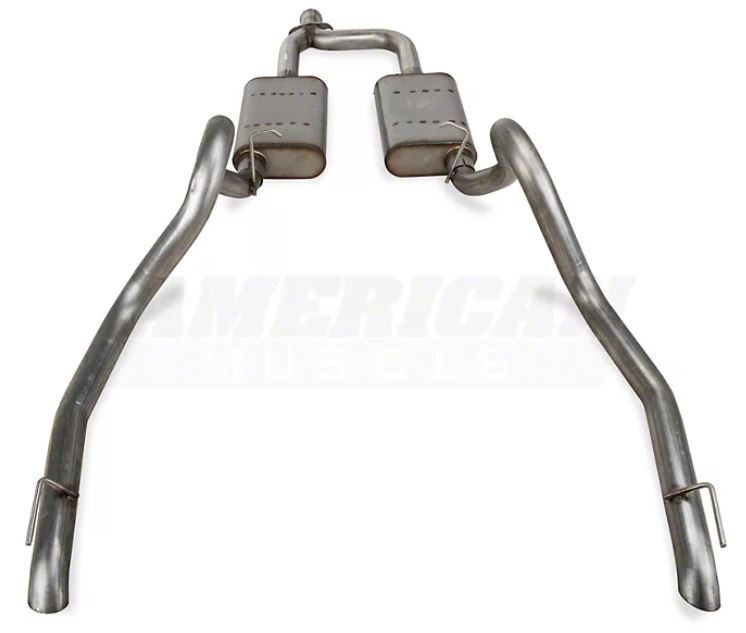 The SFM50 version includes a 2.5-inch Y-pipe, mufflers, mandrel-bent tails, and all necessary hardware. The system is specifically designed to downturn under the rear bumper, reminiscent of the 87-93 GT style.