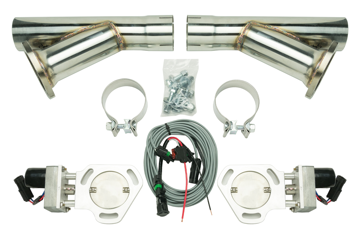 Upgrade your exhaust system with the HVE10K, a Dual Electric Cutout Kit designed for 2.5-inch exhaust systems. This electric dump option easily connects to any 2.5-inch exhaust with an approximate 12-inch straight section, providing enough clearance for the motor/valve assemblies.
