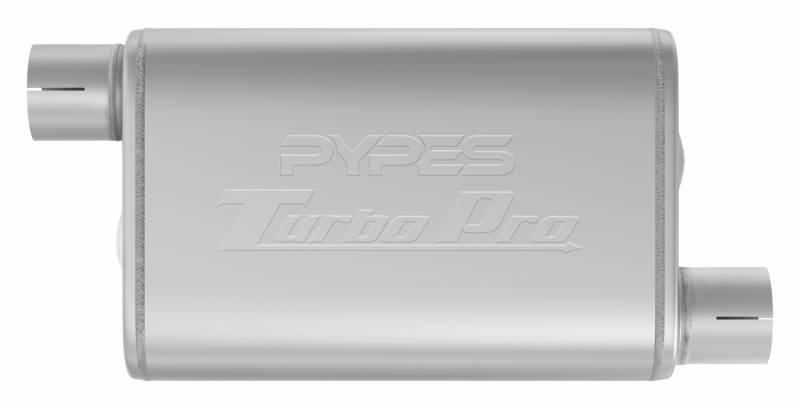 Pypes Exhaust Turbo Pro Mufflers feature flow control channels that eliminate drone, resonance, and flow turbulence while maintaining a steady flow of exhaust gases that result in a truly quiet performance exhaust note. The flow progression of this muffler mimics the CFM of a straight pipe without the annoying drone or resonance.